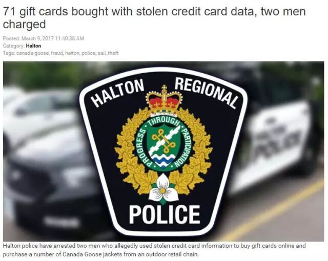 29岁的士嘉堡男子黄立德(音译)及27岁的密市男子王军于2016年10月在Burlington的Sail 户外用品连锁店,使用礼品卡购买Canada Goose外套。